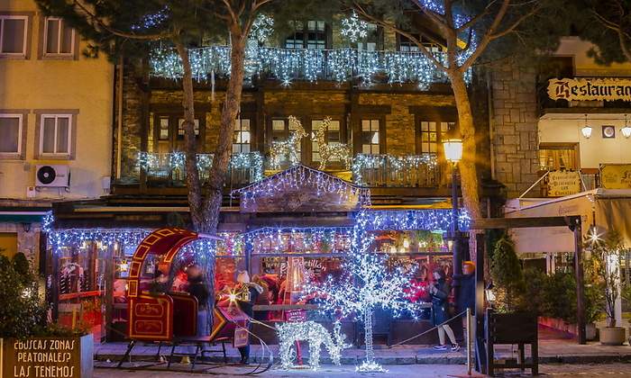 Durante el periodo navideño, Navacerrada se llena de iluminación decorativa que realza su arquitectura serrana y crea un ambiente cálido y acogedor, especialmente al caer la tarde.